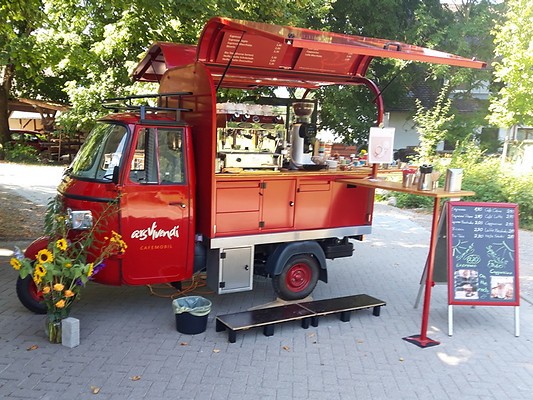 Ausgestattet mit einer hochwertigen Siebträgermaschine und entsprechender Mühle ist die Ape bestens für den unkomplizierten professionellen Einsatz geeignet. Mit ihrem Retrodesign in Rubinrot, Vollholztheke, u.v.m. ist sie ein echter „eye catcher“.