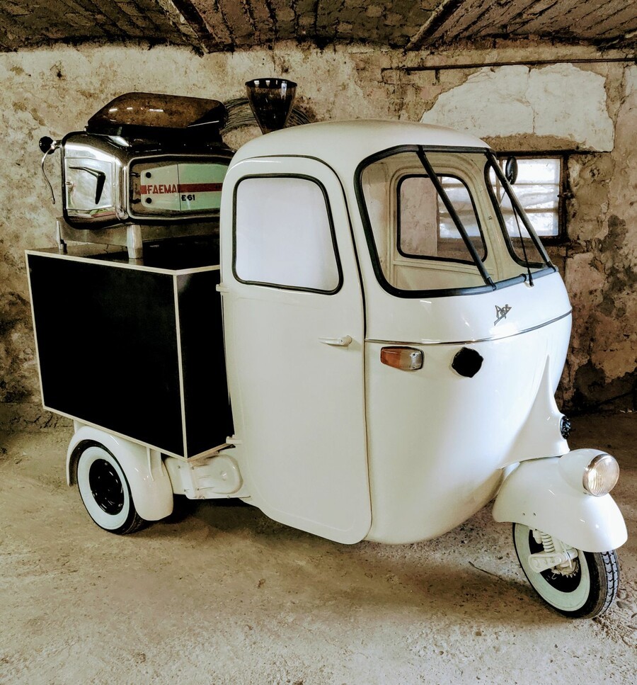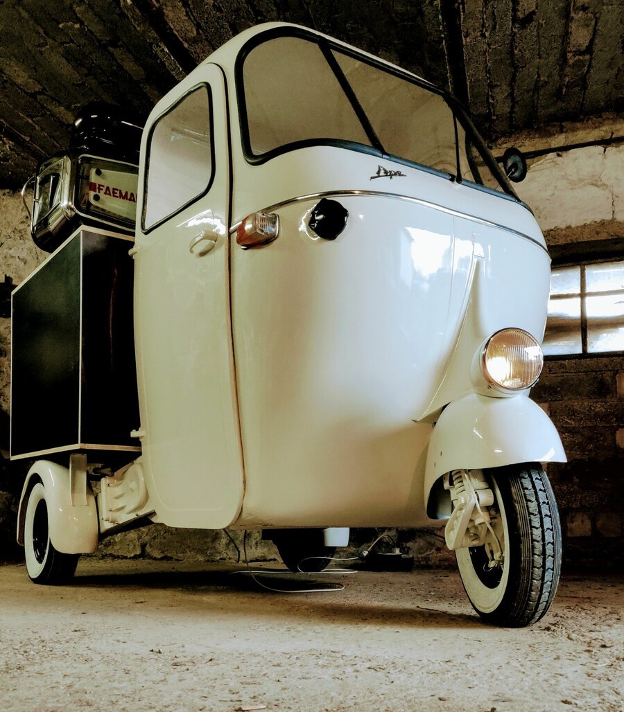 Bei uns können Sie ein retro Kaffeemobil Piaggio Ape oder verschiedene mobile Kaffeebars mieten.
