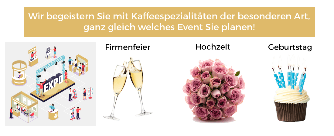 Buchen Sie unsere mobile Espressobar und lassen Sie sich von unserem geschulten Barista verwöhnen. Wir bereiten Espresso, Cappuccino und Latte Macchiato mit einer italienischen Espresso-Maschine stets in Handarbeit und mit viel Liebe zum Detail für Sie und Ihre Gäste zu. Wir verwenden ausschließlich frische 100% Arabica Bohnen und garantieren so einen einzigartigen Kaffeegeschmack. Unsere Barista sorgen zudem für eine ansprechende Präsentation und Unterhaltung Ihrer Gäste.
