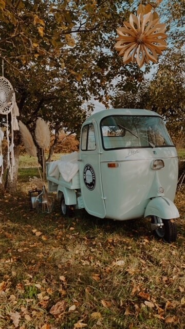 Wir haben aktuell zwei buchbare Fahrzeuge: - Einen 68’er Peugeot J7, der in seinem ersten Leben ein Schulbus in Frankreich war, bis wir ihn 2018 gefunden und zum Coffee Bus ausgebaut haben. - Eine 65'er Piaggio Ape.